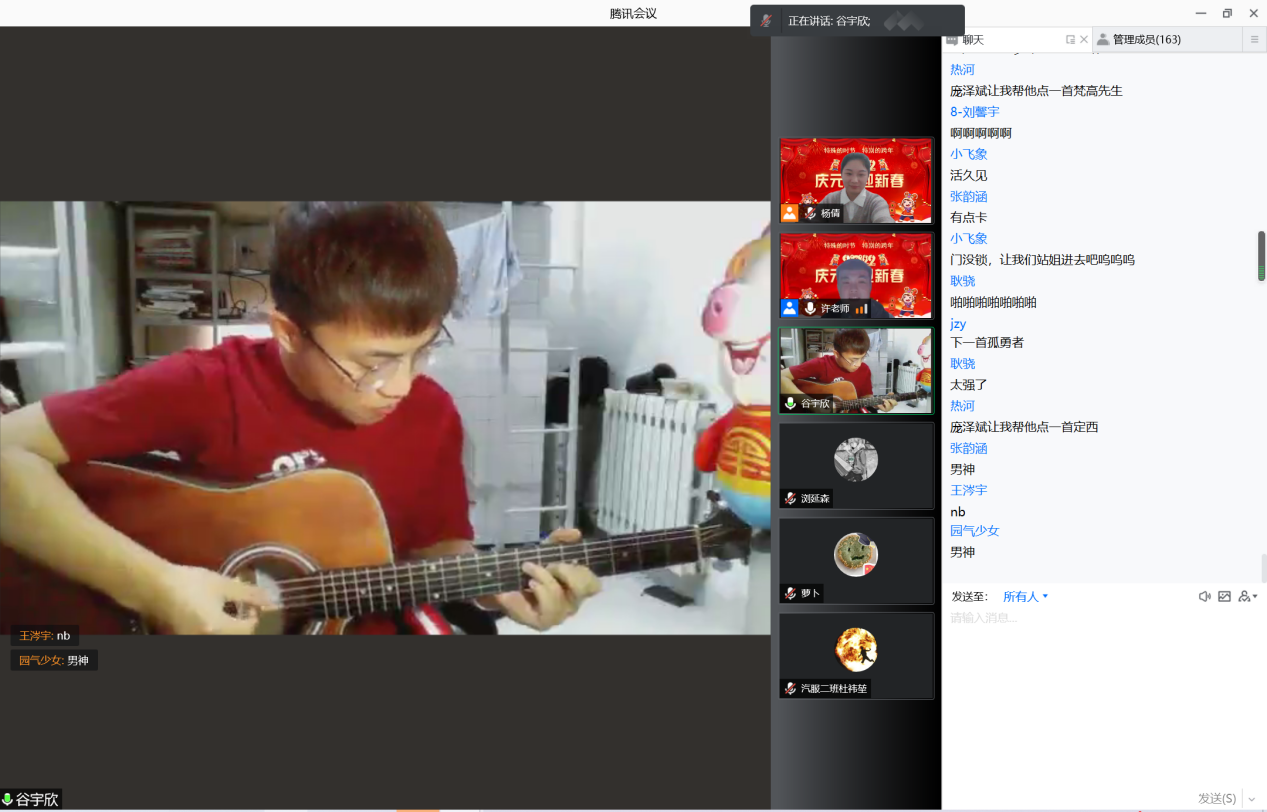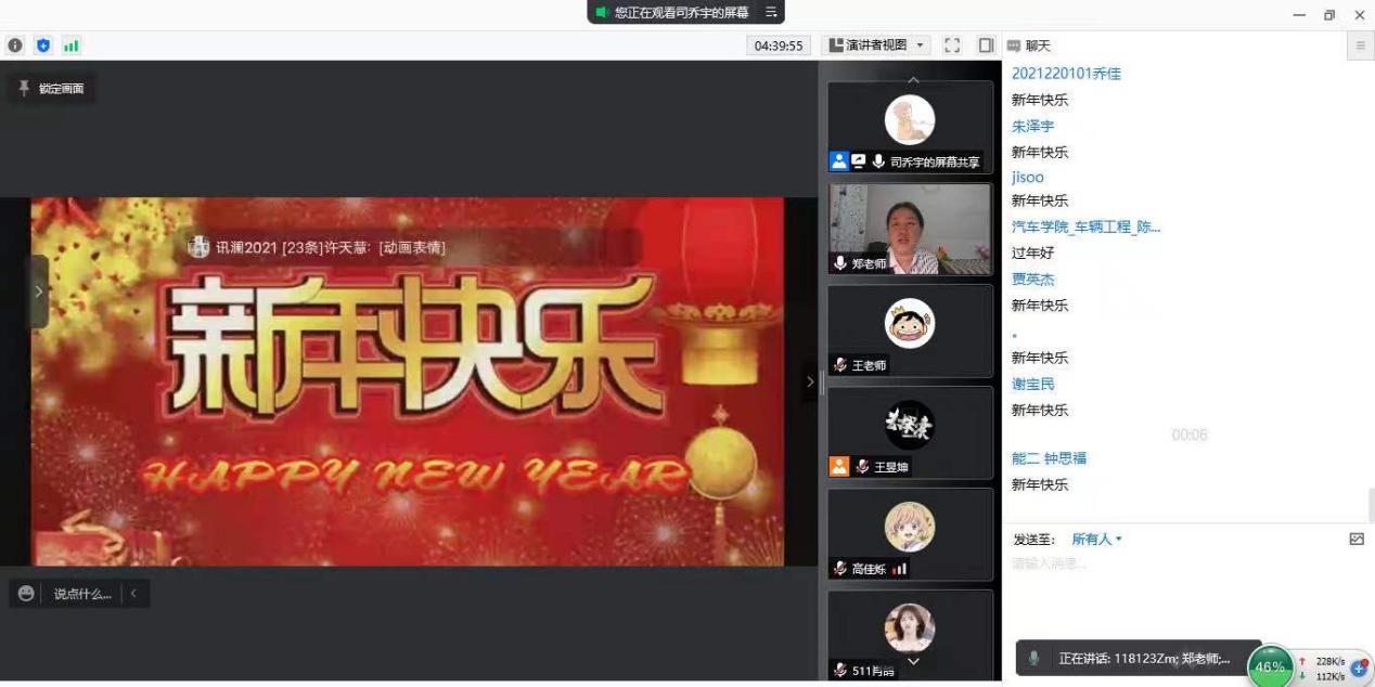 热议结束后,各年级分别组织了一次别开生面的云端跨年活动。2021级,20余名同学精心准备、协同合作,为大家带来了歌曲表演、三句半、体能展示等10一个节目;2020级,为同学们准备了贺岁观影、掌上欢乐和群雄逐鹿三个环节的游戏,同学们可以按照自己的爱好和特长,选择自己喜欢的游戏项目;2019级,在活动中设计了最感动的瞬间分享、你画我猜、才艺展示、新年祝福等环节,师生云端相聚、共迎新年;2018级,邀请同学们做《回顾2021,展望2022》分享和才艺展示,并为每位展示分享同学送上一份新年礼物,整个活动过程暖意融融、和谐融洽。