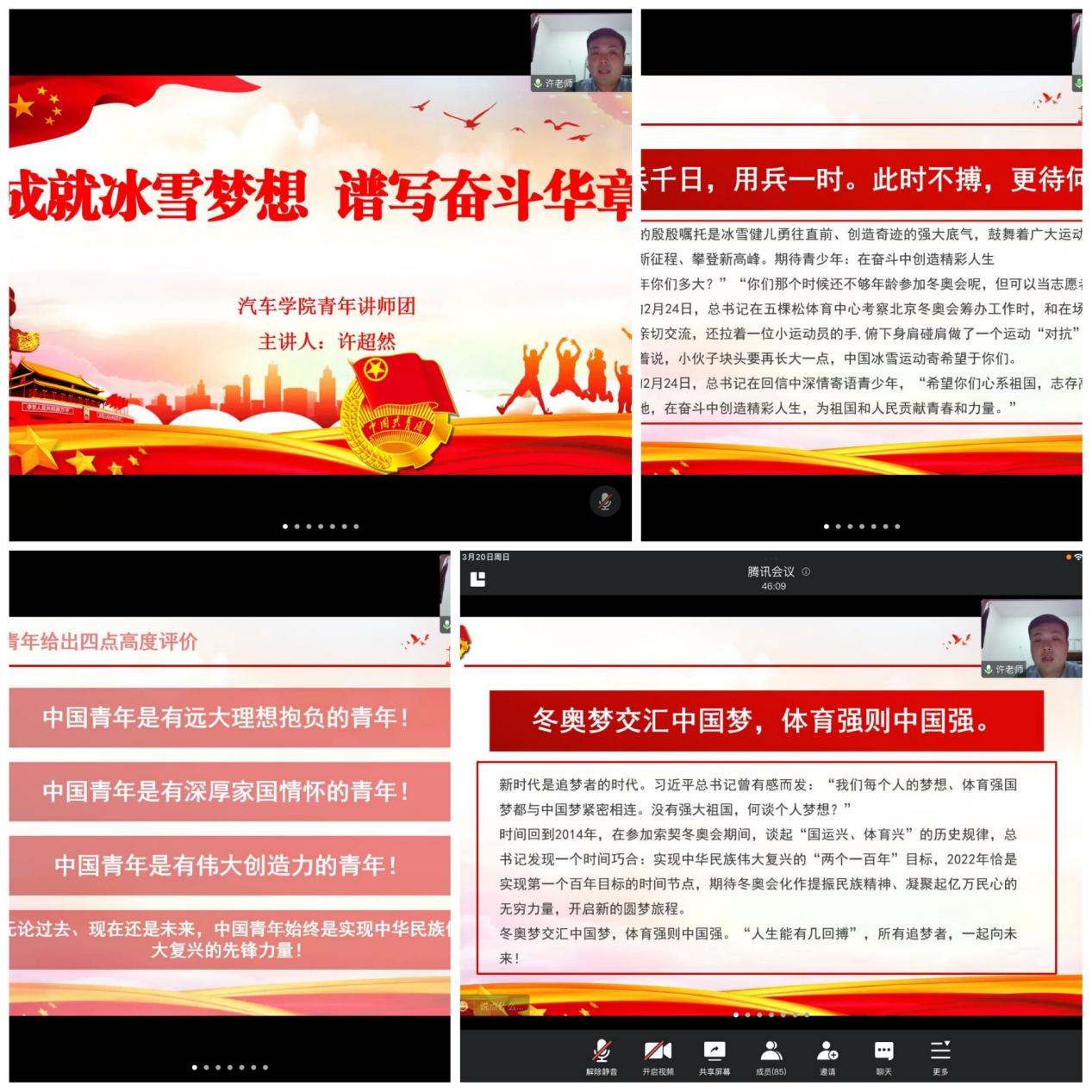 2022年2月24日,习近平总书记专门给中国冰雪健儿代表回信,对冰雪健儿在北京冬奥会取得的优异成绩给予充分肯定,对广大青少年提出了志存高远,脚踏实地,在奋斗中创造精彩人生,为祖国和人民贡献青春和力量的殷切期望。为进一步贯彻落实好总书记重要回信精神,凝聚成人视频 师生力量,引导广大师生向中国冰雪健儿学习,用青春力量书写时代华章。3月15日至3月21日,成人视频 组织各本科生党支部、团支部、青马班及团学组织运用多种方式深入学习习近平总书记给中国冰雪健儿重要回信精神。