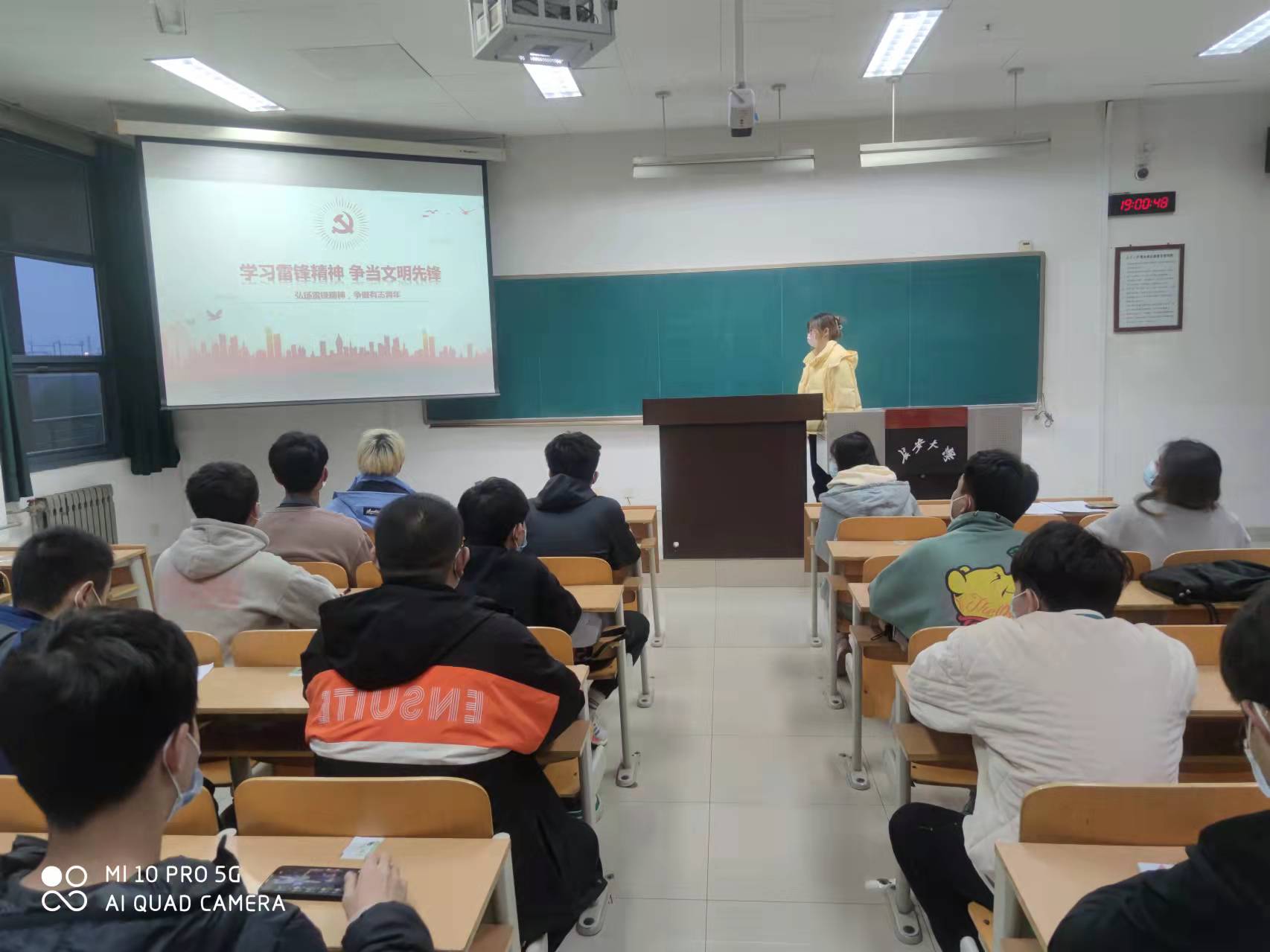 为纪念雷锋同志逝世50周年,引导同学弘扬雷锋精神和时代精神,2020级车辆工程专业四班在班团支书马格格的带领下,于3月20日晚上7点在wm1315教室开展了主题为“学习雷锋精神,争当文明先锋”的班会。车辆四班全体同学到场,并遵守防疫要求佩戴口罩,隔位就坐。