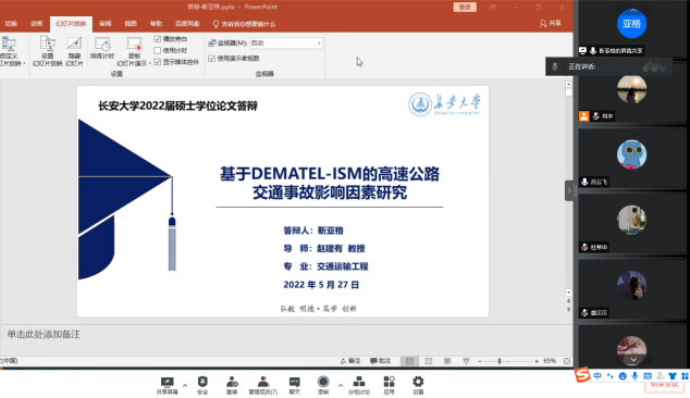 会议首先由赵建有教授明确了本次会议的主题,即围绕2022届硕士研究生学位论文开展预答辩及修改工作。2022届硕士研究生依次进行了学位论文预答辩。吕云飞同学的学位论文题目为《重大突发公共卫生事件下城市应急物流车辆路径优化研究》,采用了多粒子目标优化的方法确定车辆路径问题;谢伟国同学对学位论文《城乡公交驾驶员驾驶行为影响因素及其改善措施研究》进行了汇报,介绍了城乡公交驾驶员驾驶行为量表设计和结构方程模型及算法等工作;吕欣丽同学提出了城乡纯电动公交车行车计划优化问题,基于Anylogic软件进行了仿真,实现了优化前后的指标对比;靳亚格同学基于dematel-ism方法,对高速公路交通事故影响因素进行了研究,为高速公路驾驶安全保障提供了建议与参考;杜帮申同学立足于新时代背景,探究了城乡居民出行特性,对城乡出行客运结构作出了优化调整。