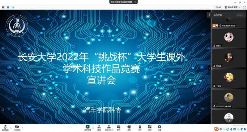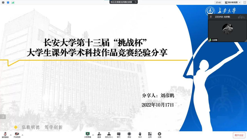 2022年10月17日晚,成人视频 “挑战杯”大学生课外学术科技作品竞赛宣讲会在线上顺利举行。成人视频 大学生科技创新创业协会指导老师许超然、成人视频 2019级本科生刘彦鹏、王涔宇同学参与本次会议的宣讲。