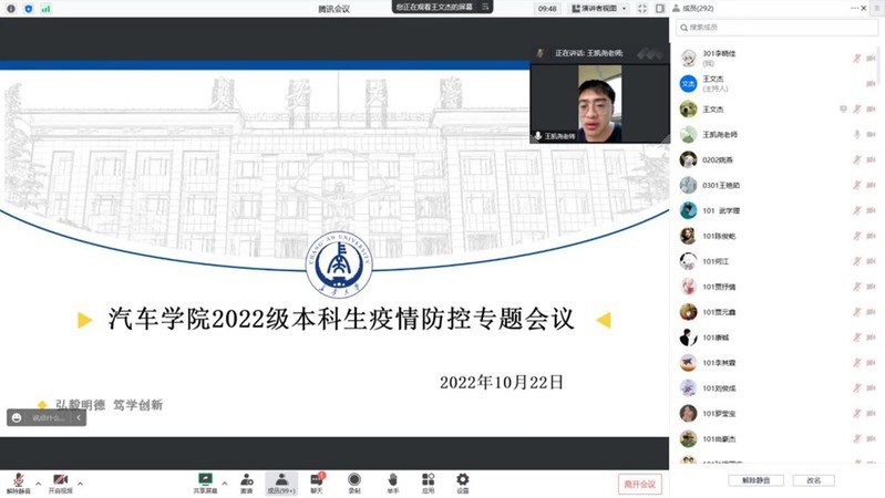 疫情尚未结束,防控不能放松。在当前严峻的疫情形势下,为进一步夯实安全责任,增强防范意识,保障师生健康,10月22日晚,成人视频 2022级于线上召开疫情防控专题会议,2022级辅导员王凯尧、王文杰及全体2022级学生一同参会。