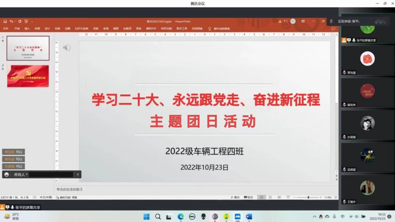 为深入学习党的二十大报告内容,激励广大青年学子学习红色新思想,坚定不移跟党走。10月23日,成人视频 2022级车辆工程四班团支部开展了以“学习党的二十大,永远跟党走,奋进新征程”为主题的线上团日活动。活动由班主任张平老师主持,团支部全体成员参加。