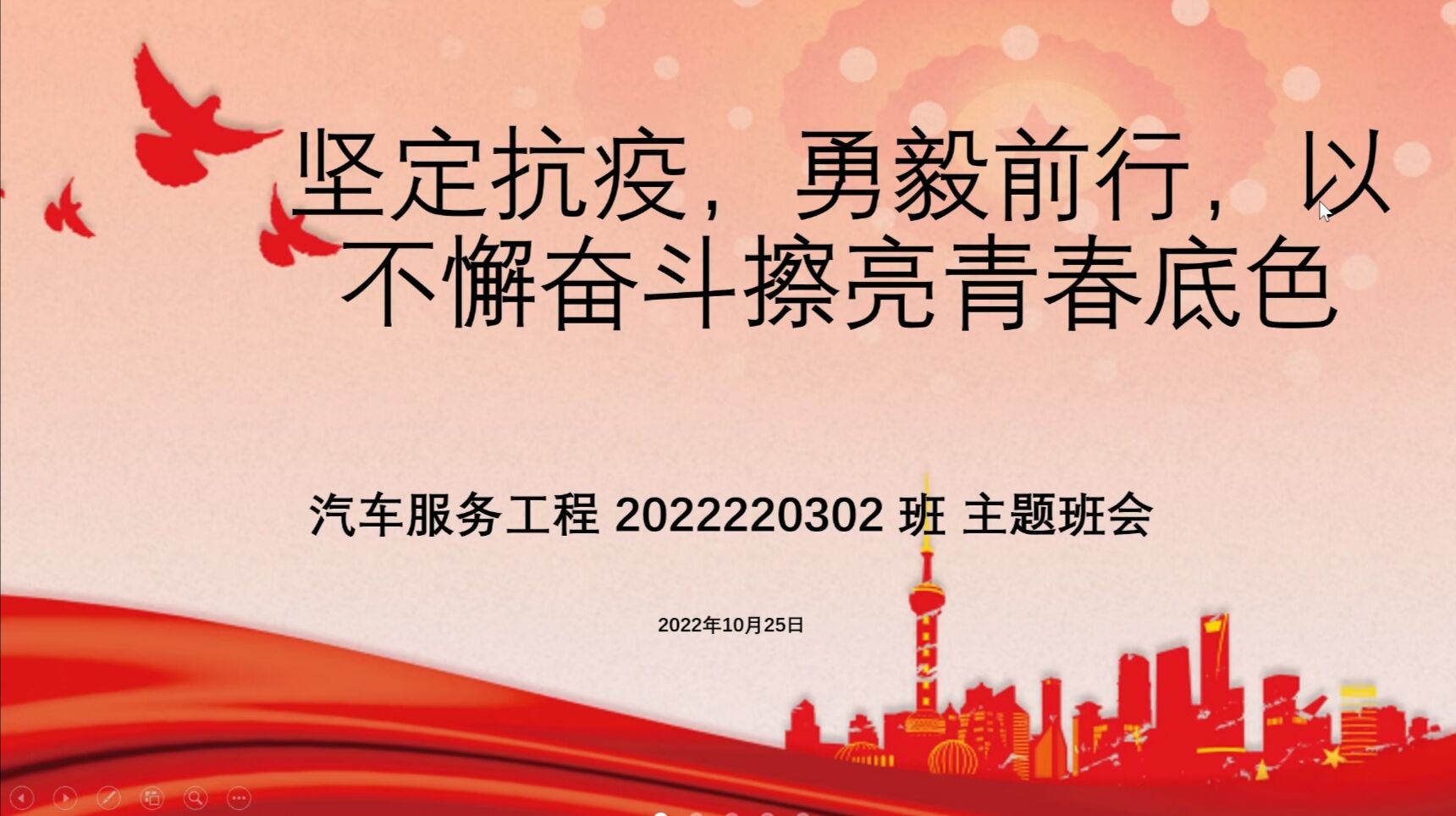 “云天收夏色,木叶动秋声。”2022年10月25日,成人视频 2022级汽车服务工程二班通过腾讯会议形式召开“坚定抗疫,勇毅前行,以不懈奋斗擦亮青春底色”主题班会,学生办公室主任郑文捷及班级全体同学参会,班主任张凯超主持。