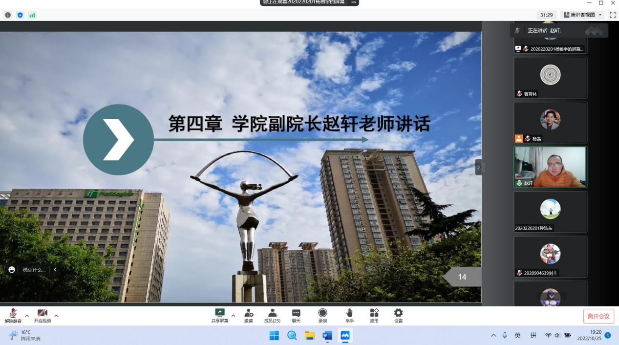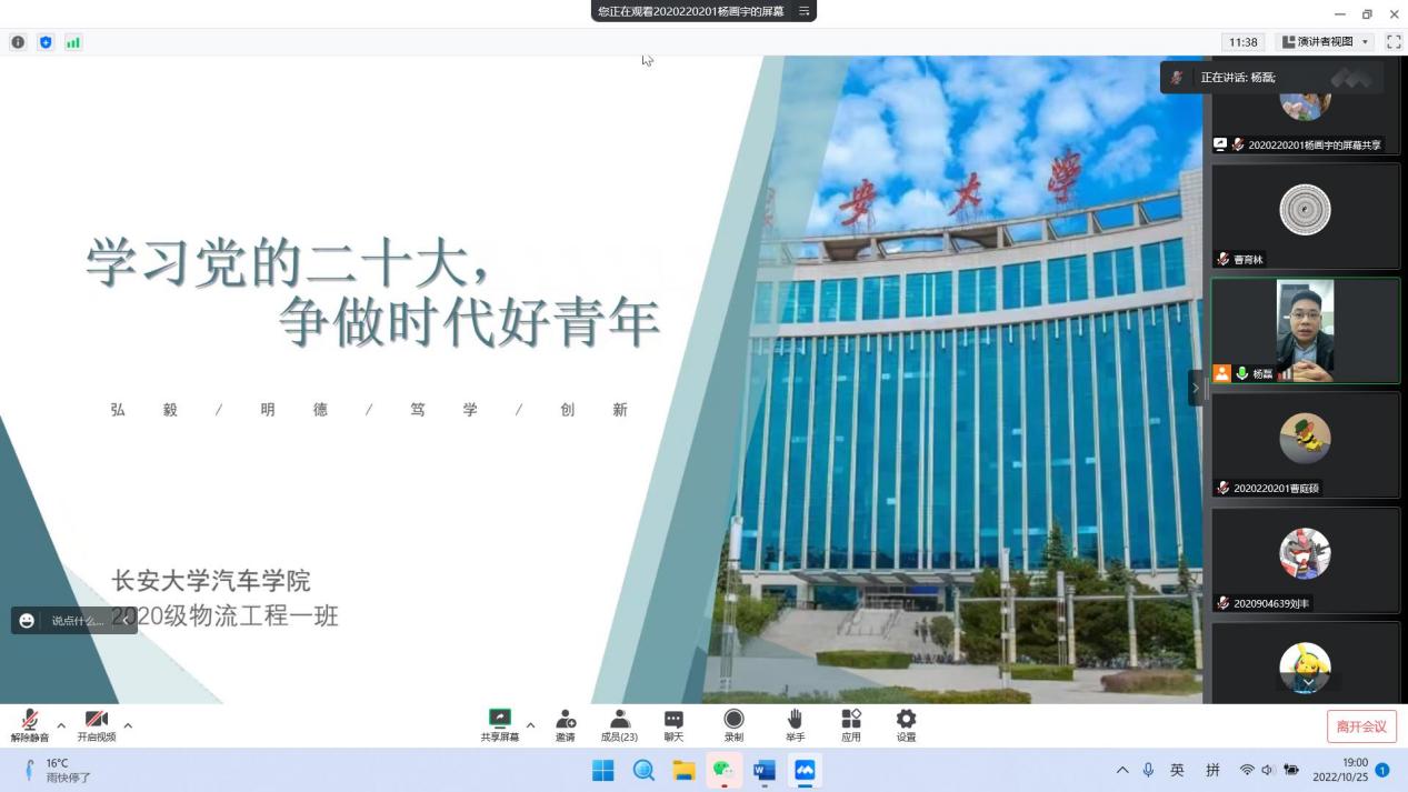 为深入学习党的二十大精神,全面落实好学校防疫工作各项要求,10月25日,成人视频 2020级物流工程一班举办“学习党的二十大,争做时代好青年”主题线上班会。成人视频 副院长赵轩教授出席本次班会,2020级物流工程一班全体同学参会,本次班会由2020级辅导员杨磊主持。
