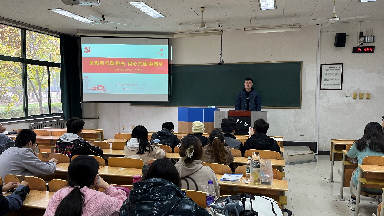 11月9日,成人视频 本科生第三党支部召开“学习宣传贯彻党的二十大精神”专题学习。会议由党支部书记许超然主持,支部全体党员参会。本次专题学习由党支部组织委员王帅领学,他带领同志们深入学习了包括党的中心任务、中国式现代化的中国特色和本质要求、全面建设社会主义现代化国家的首要任务以及跳出历史周期率的第二个答案等内容。他强调,身为新时代新青年,我们应当紧紧跟党走,提高政治站位,将自身命运同党和国家联系在一起,努力锤炼本领,增强创新意识,为实现中华民族伟大复兴贡献我们的青春力量。支部书记许超然作总结发言,他指出,学生党员要深入学习宣传贯彻党的二十大精神,要将党的二十大报告的要求同具体实际相结合、同学生责任相结合、同个人发展相结合,坚持把自己摆进去、把使命摆进去、把身份摆进去,要以“时不我待”的紧迫感和“舍我其谁”的责任感积极投身全面建设社会主义现代化国家的奋斗征程。
