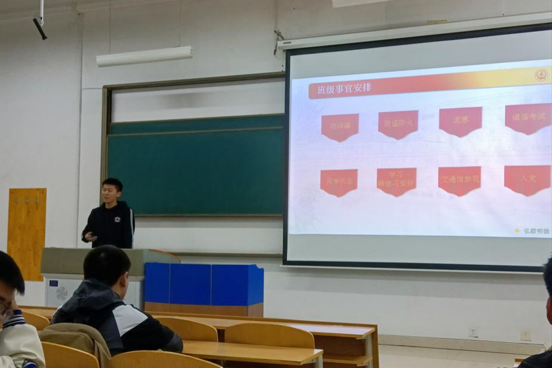 为妥善安排新学期工作安排,团支书田浩人给同学们分点介绍了接下来的工作安排,表示新学期充满着更多新的挑战,同学们要保持最高的热情配合学院接下来的工作安排。