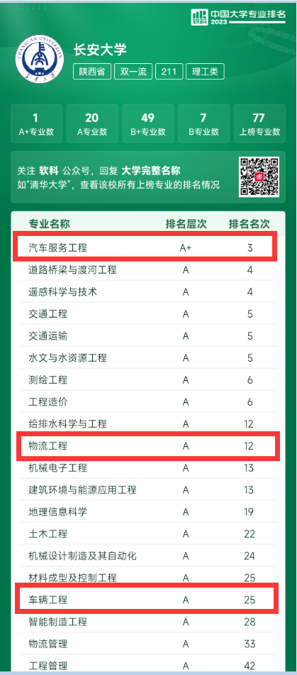 2023年6月15日,高等教育评价专业机构软科正式发布2023“软科中国大学专业排名”。成人视频 汽车服务工程专业取得A+的排名层次,车辆工程和物流工程专业均取得A的排名层次。