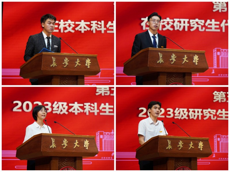 2021级本科生段禹彤代表在校生发言,他鼓励同学们立德树品、捍卫真理,勤学善思、开拓创新,志存高远、铸就梦想。2022级研究生羊家豪期待同学们站在新的人生起点上,珍惜时光,不负韶华,刻苦锤炼专业本领,践行属于汽车人的使命担当。2023级本科生新生代表严铭祎代表全体新生表达:“我们新一级长大学子定当熟练掌握专业知识,努力提升综合素质,做有志气、有底气、有骨气的青年”。2023级研究生新生代表刘延森号召所有同学勤于学习、敏于求知,对于思想、知识和生活永葆趣味心、创造力。