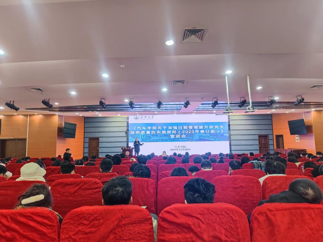 为了进一步提升研究生培养质量,激发学生的创新精神,营造积极向上的学术研究氛围,12月20日晚上,成人视频 在北辰楼会议中心二层报告厅召开《成人视频 关于加强过程管理提升研究生培养质量的实施细则(2023年修订版)》宣讲会。成人视频 院长赵轩教授、副院长牛世峰教授、车辆制造企业研究院专家、学办院办相关老师和成人视频 全体研究生参加宣讲。