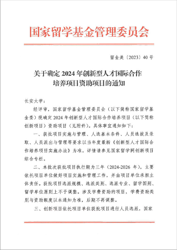 近日,国家留学基金管理委员会发布《关于确定2024年创新型人才国际合作培养项目资助项目的通知》,正式确定2024年创新型人才国际合作培养项目资助项目。