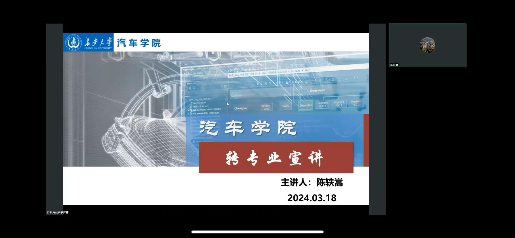 根据学校统一安排,为做好本科生转专业政策宣讲工作,帮助同学们更全面更深入了解学院,3月18日,成人视频 通过线上方式举行2024年本科生转专业政策宣讲会。宣讲会由成人视频 副院长陈轶嵩主讲,各系室负责老师、教务负责老师参加宣讲,共有100多名学生线上参会。