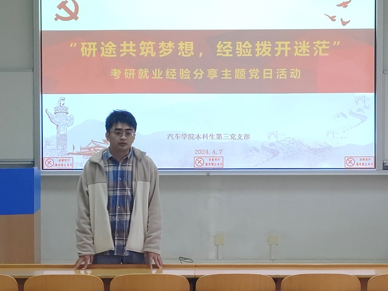 为进一步发挥支部的服务功能,增强学生党员的凝聚力与先进性,打造以党组织和党员为核心的“同心圆”,4月10日晚,成人视频 本科生第三党支部于WX4201面向学院汽车服务工程专业学生开展了“研途共筑梦想,经验拨开迷茫”考研就业经验分享主题党日活动。活动由支部书记王凯尧主持,支部全体党员及50余名有考研就业意愿的汽车服务工程专业学生参会。