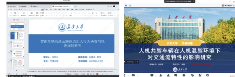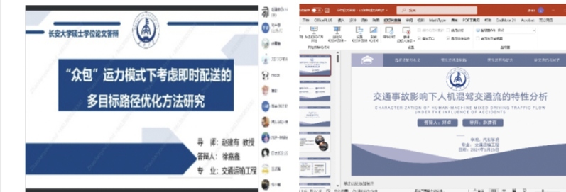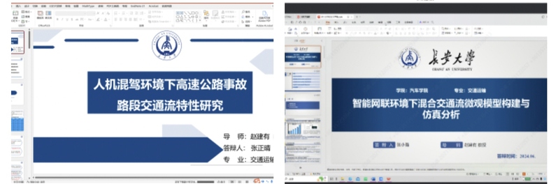 随后硕士研究生依次进行了汇报。张正晴的学位论文题目为:《人机混驾环境下高速公路事故路段交通流特性研究》。张正晴从交通流相关理论与人机混驾交通流车辆的驾驶行为分析、人机混驾交通流车辆行驶模型构建及混合交通流仿真分析、高速公路事故路段交通流建模与仿真、高速公路事故路段人机混驾交通流影响分析等方面进行了汇报。赵建有教授指出张正晴同样存在汇报时长过长的问题,希望能够精简内容,缩短汇报时长。