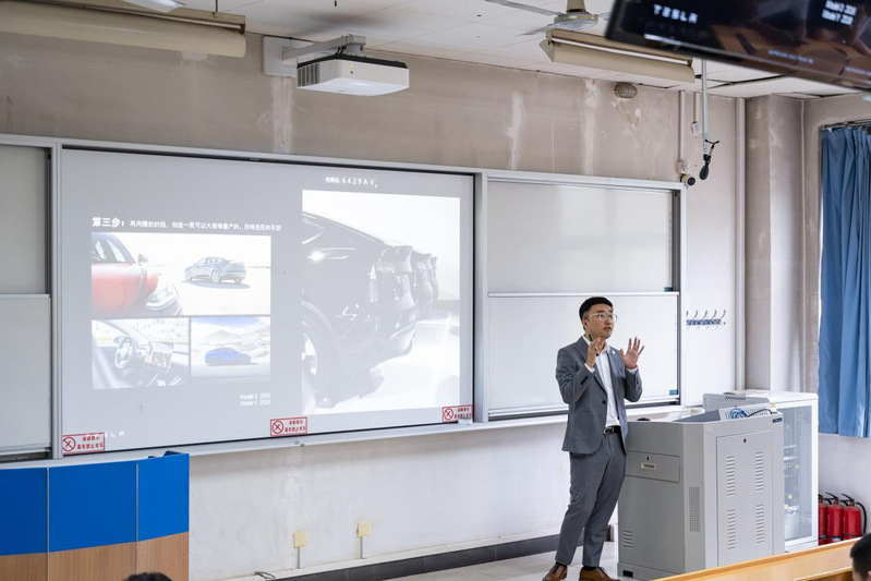 讲座伊始,刘泽玉介绍了特斯拉的由来及公司发展的内驱力。他提到,特斯拉作为一家电动汽车及清洁能源行业的跨国公司,自2003年成立以来,始终坚持创新、可持续、安全和卓越的核心价值观,致力于向大众推出引人入胜的电动汽车,加速能源的可持续快速发展。