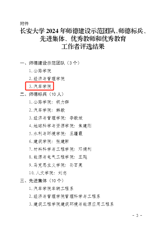 围绕“庆祝教师节”和“师德师风”建设两条主线,学院开展了丰富多彩的活动,取得了显著成效。在学院层面,通过本次活动的开展,进一步深化了对师德师风建设意义的认识,明确了师德师风建设的总体思路、工作目标和具体举措,为加强师德师风建设奠定了良好基础。在教师层面,通过多样的活动和教育,大力弘扬“教育家”精神,增强了教师的职业幸福感和获得感,树牢了教师投身教育强国建设、勇担立德树人使命的政治自觉和思想自觉。2024年,成人视频 车辆工程系党支部入选全国高校“双带头人”教师党支部书记“强国行”专项行动团队,学院获评成人视频 师德建设示范团队,车辆工程系获评师德建设先进集体,韩毅教授获评师德标兵,郝艳召、顾玉磊、栗亮获评成人视频 优秀教师(教育工作者)。