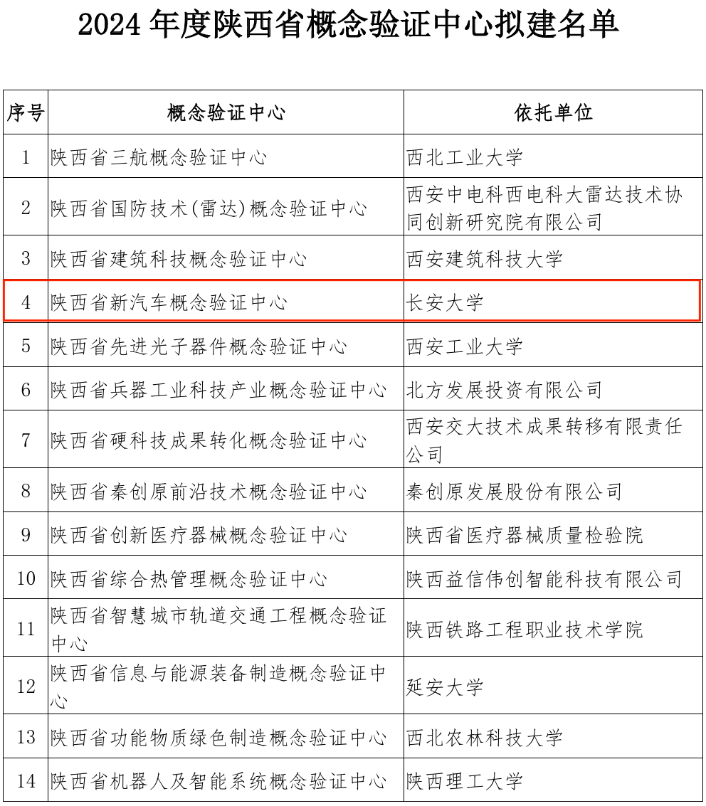 近日,陕西省科技厅公示了2024年度陕西省概念验证中心拟建名单,成人视频 陈轶嵩教授作为负责人申报的“陕西省新汽车概念验证中心”成功获批。该中心是成人视频 在科技成果转化方面的新突破,也是成人视频 首个概念验证中心,全省首个专注于验证汽车新技术、解决汽车产业科技成果转化“最初一公里”问题的科技成果验证平台。