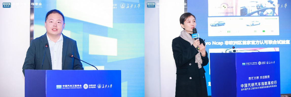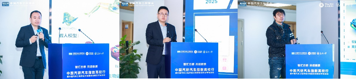 中国汽研指数体系研究专家刘煜和唐宇、车辆工程系朱国华副教授依次分享了AC-HUMs中国体征男性系列人体数字有限元模型、汽车智能安全测评技术的创新与实践、混杂纤维复合材料车身构件“材料-结构”一体化设计等前沿研究成果。