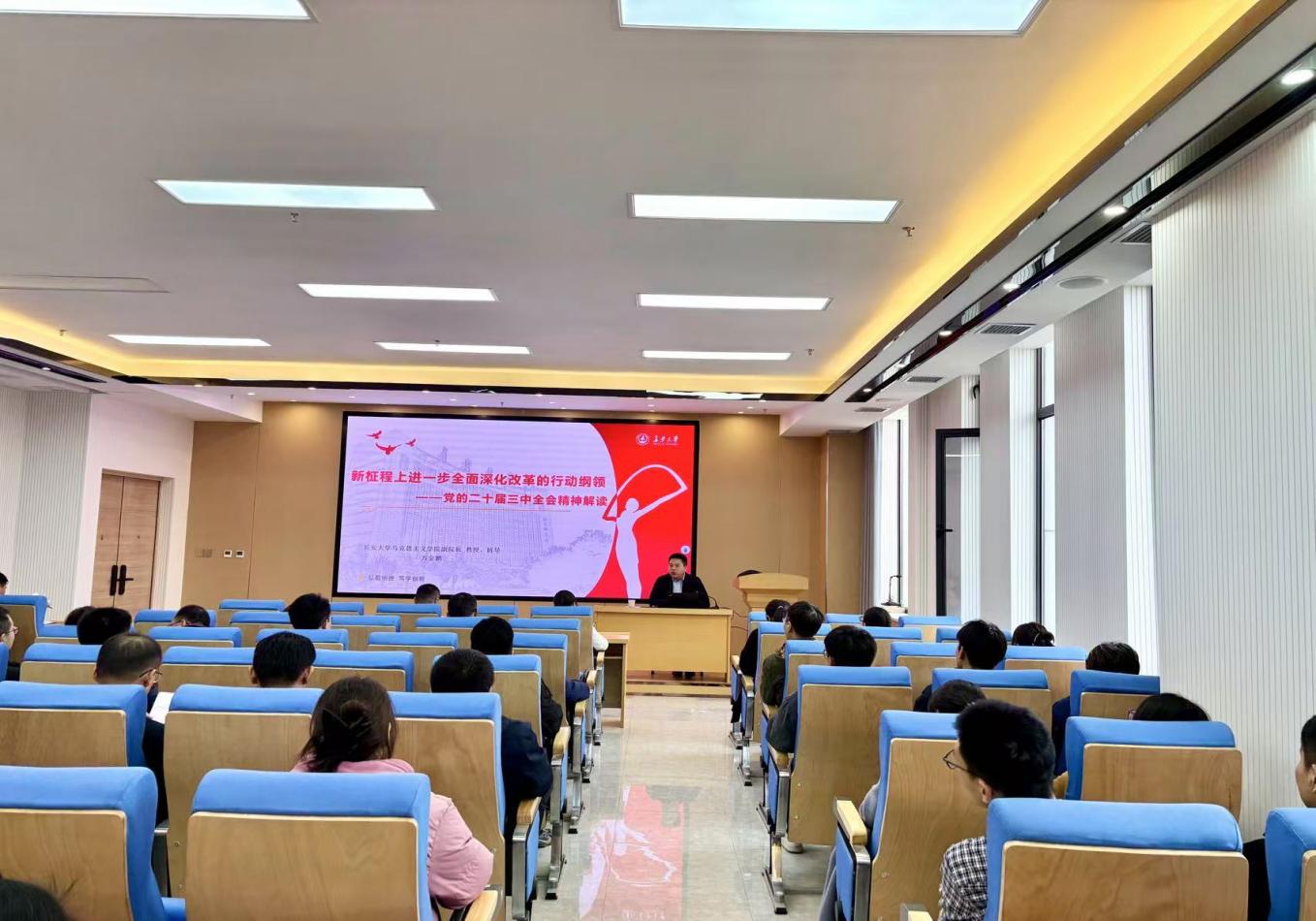 12月4日,成人视频 举行学习贯彻党的二十届三中全会精神宣讲报告会。报告会邀请到成人视频 马克思主义学院万金鹏教授主讲,学院党委理论学习中心组全体成员出席会议,全体教职工以及各学生支部党员代表参加会议,党委副书记、副院长、纪委书记周姗姗主持会议。
