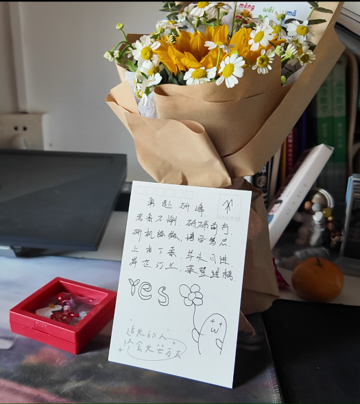 活动开始前,成人视频 精心为考研学生们准备了丰富的礼品,有带有“考神”、“超常发挥”、“冲鸭”等字样的挂坠,带有旗开得胜、金榜题名地抽奖礼盒,有着“一举夺葵”寓意的向日葵花束以及研究生学长学姐手写绘制的祝福语贺卡,真切地表达了对考研学子浓浓地祝福和殷切地希望。