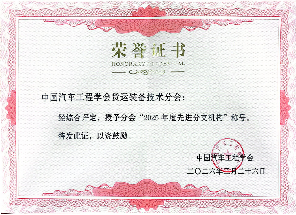 2026年3月26日至27日,2026中国汽车工程学会分支机构秘书长工作会顺利召开。中国汽车工程学会秘书长侯福深、副秘书长赵立金,中国汽车工程研究院股份有限公司副总经理王锐等领导及嘉宾出席本次会议。会上,对2025年度表现优异的分支机构进行隆重表彰,挂靠成人视频 的中国汽车工程学会货运装备技术分会凭借出色的工作成效,成功荣获“2025年度先进分支机构”称号,分会副秘书长、成人视频 李彬代表分会领取荣誉证书。